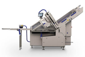 An automatic function removes the first cut and end waste for consistent portions. A separating belt with automatic vertical swing supports neat stack formation, and a long straight outfeed transfers portions smoothly for downstream packing.